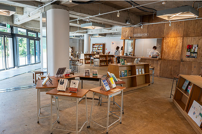 入り口には施設の総合受付、コーヒースタンドを兼ねたブックラウンジ。定期的にテーマを設けた新刊書が並ぶ。思わぬ本との出合いの機会に。