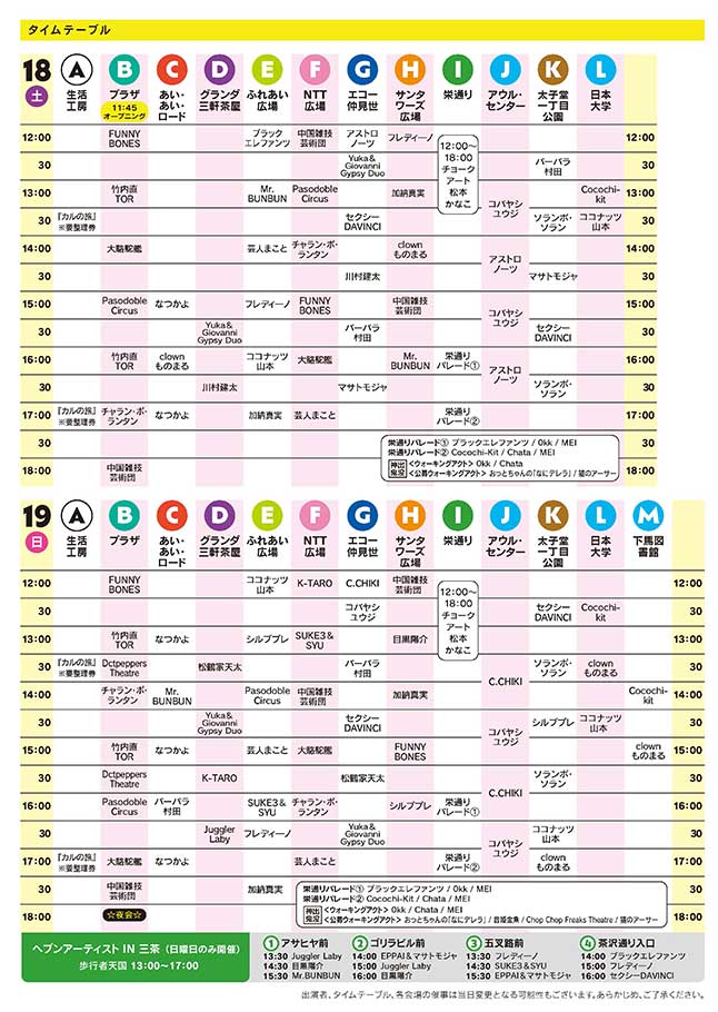 アストロノーツ(10/18(土)のみ)/EPPAI&マサトモジャ(10/19(日)のみ)/Okk/ 加納真実/川村建太(10/18(土)のみ)/clownものまる/芸人まこと/ K-TARO(10/19(日)のみ)/Cocochi-kit/ココナッツ山本/コバヤシユウジ/ C.CHIKI(10/19(日)のみ)/Juggler Laby(10/19(日)のみ)/松鶴家天太(10/19(日)のみ)/ シルヴプレ(10/19(日)のみ)/SUKE3&SYU(10/19(日)のみ)/セクシーDAVINCI/ ソランポ・ソラン/大駱駝艦/竹内直 The Organic Resonations/Chata/チャラン・ポ・ランタン/ Dctpeppers Theatre(10/19(日)のみ)/なつかよ/バーバラ村田/FUNNY BONES/ ブラックエレファンツ/フレディ―ノ/マサトモジャ(10/18(土)のみ)/松本かなこ/ Mr.BUNBUN/MEI/目黒陽介(10/19(日)のみ)/Yuka&Giovanni Gypsy Duo