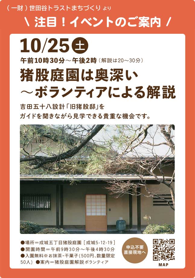 10/25(土)成城5丁目猪股庭園にて、 ボランティアが解説する見学会「猪股庭園は奥深い」が開催されます。近代数寄屋建築の邸宅を解説でより深く堪能できる見学会です。