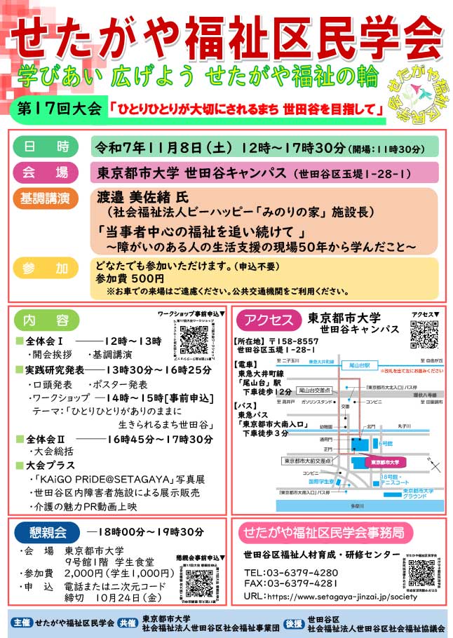 11/8(土)東京都市大学 で、「せたがや福祉区民学会第17回大会」が開催されます。今年のテーマは「ひとりひとりが大切にされるまち世田谷を目指して」。区内大学、福祉事業者、区民、行政が一堂に会し、基調講演や55件の事例発表を行います。是非ご参加ください。
