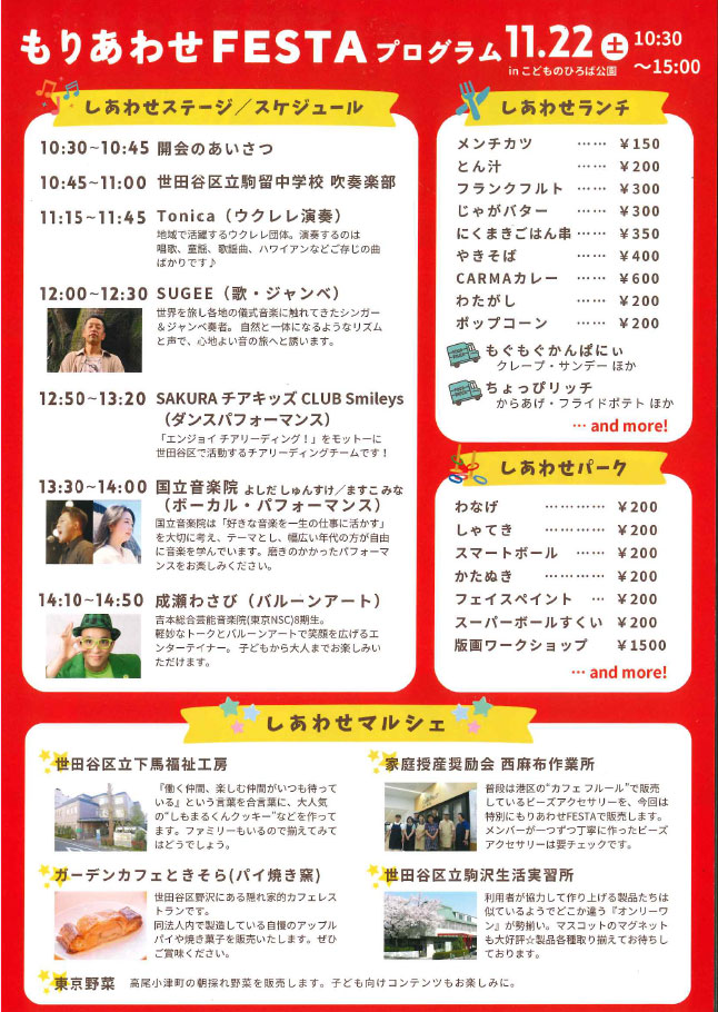 11/22(土)下馬の世田谷福祉作業所が、隣接する区立こどもの広場公園で、「もりあわせFESTA 2025」を開催します。会場では、ウクレレ、ダンスパフォーマンスなどの「しあわせステージ」や飲食ができる「しあわせランチ」コーナー、わなげやしゃてきなどの「しあわせパーク」で遊べます。また、「しあわせマルシェ」ではクッキーやパイなどのお菓子のほか、ビーズアクセサリー、朝、採れたての東京野菜のお買い物もできます。