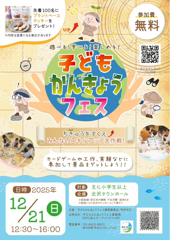12/21(日)北沢タウンホールで、「子どもかんきょうフェス~ちきゅうをすくえ!みんなのスキルアップ大作戦!~」が開催されます。主に小学生以上を対象とした、工作やゲーム、気候変動がわかる実験の体験などで、楽しみながら学べる環境イベントです。