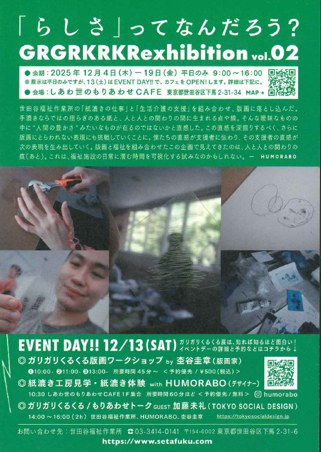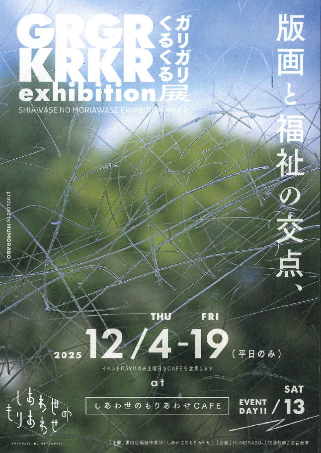 12/4(木)~12/19 (金)下馬の世田谷福祉作業所「しあわ世のもりあわせCAFE」で、版画と福祉の交点「ガリガリくるくる展 Vol.02」が開催されます。会場では、版画の作品展示のほか、12/13(土)版画家による版画体験ワークショップ、紙漉き工房見学・体験などのイベントもあります。また、作品づくり等の活動から「福祉」について語り合う座談会もあります。迫力ある版画作品を眺めながら、一緒に版画や紙漉き体験はいかがでしょうか。