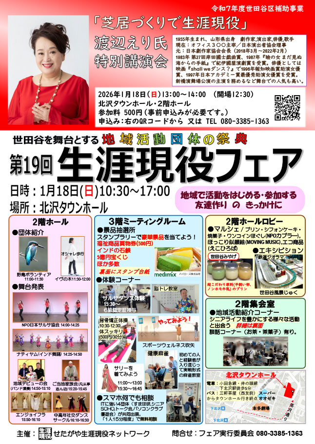 1/18(日)北沢タウンホールで、「第19回 生涯現役フェア」が開催されます。講演会、ステージパフォーマンスのほか、団体の活動紹介のパネルや体験コーナーなど盛りだくさんの発表会です。シニア世代の方々で、地域で活動をはじめる・参加する方法や友達作りのきっかけを探している方におすすめのイベントです。