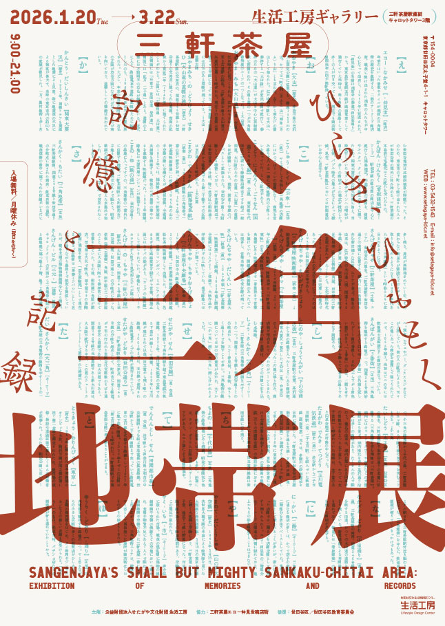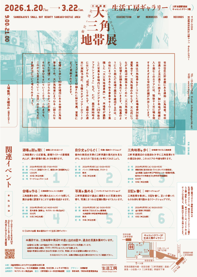 1/20(火)~3/22(日)の期間、三軒茶屋キャロットタワー内 生活工房にて、企画展「三軒茶屋 大三角地帯展 —ひらき、ひもとく記憶と記録—」が開催されます。三軒茶屋にある通称“三角地帯”。この三角地帯をテーマに各種スタディツアーやワークショップを通して、記憶と記録をひもとき「生活」のかたちと未来への残し方について考える、来場者参加型の展覧会です。