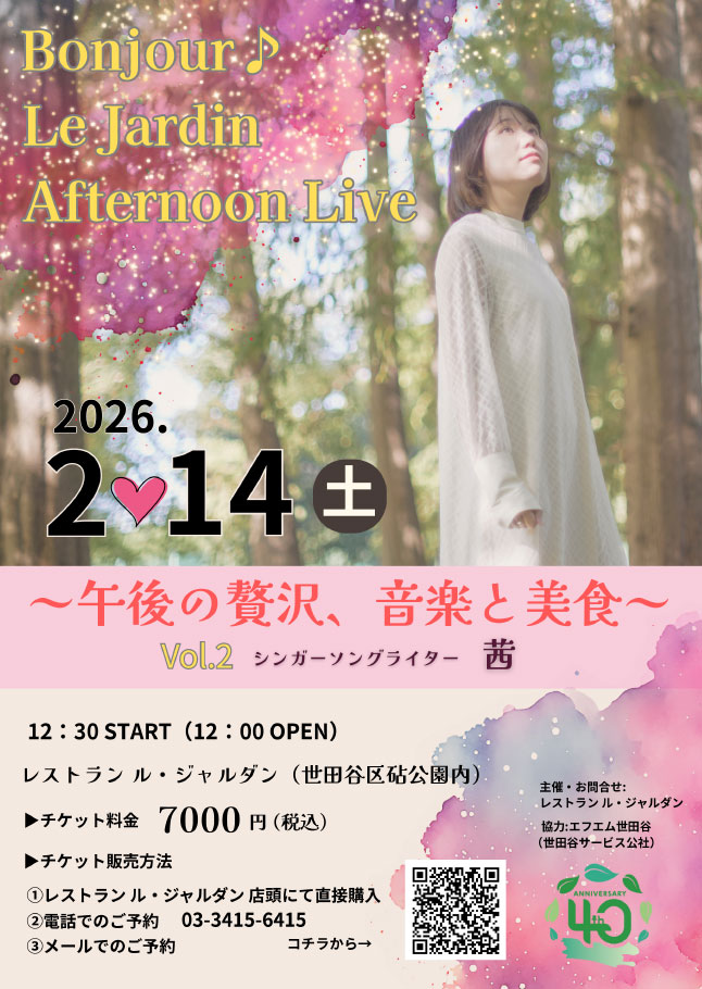 Bonsoir ♪ Le Jardin Afternoon LIVE シンガーソングライター茜 ~午後の贅沢、音楽と美食~