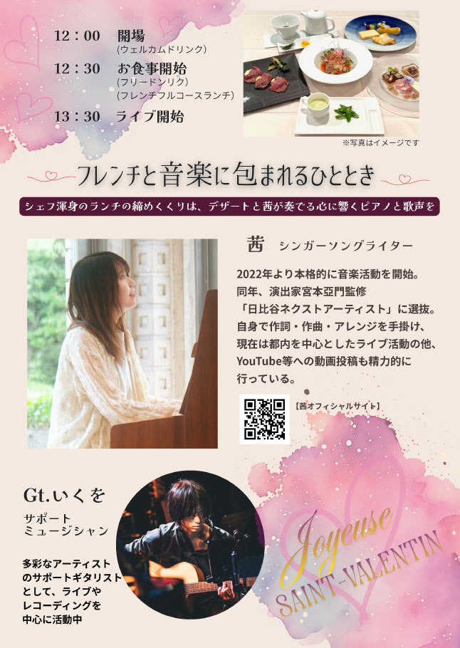 このたび当店では、フレンチフルコースランチと茜さん音楽ライブを開催いたします。フレンチフルコースのランチと、シンガーソングライター茜(あかね)のライブパフォーマンスです。シェフ渾身のをランチの締めくくりは、茜が奏でる心に響くピアノと歌声。是非お越しください。