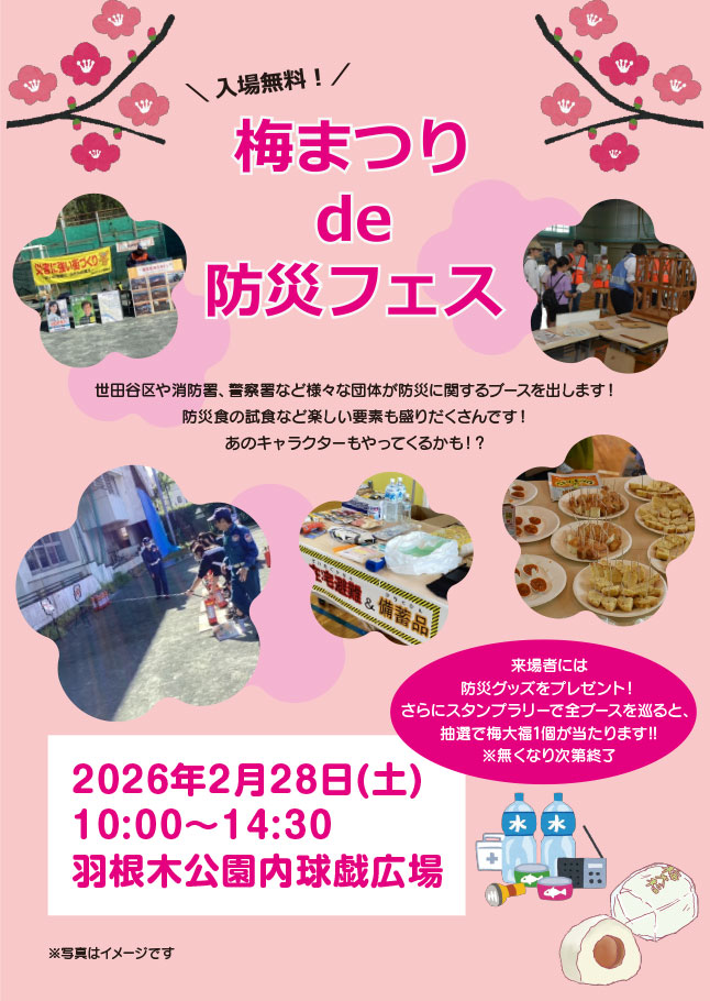 2/7(土)~3/1(日)羽根木公園では、「せたがや梅まつり」が開催されます。紅梅約280本、白梅約390本の計約 670本を数える都内でも屈指の観梅の名所です。期間中、恒例の野点・茶席に模擬店・物産展のほか、お子様も楽しめるイベントや防災グッズがもらえる「梅まつりde防災フェス」が今年も開催されます。香しく可憐な梅花を愛でながら春の訪れを楽しみませんか。
