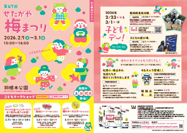 せたがや梅まつりは1978年の第1回開催から数えて、今年で第47回目を迎えました。ご家族で楽しめる様々な催し物が、皆様のご来場をお待ちしております。