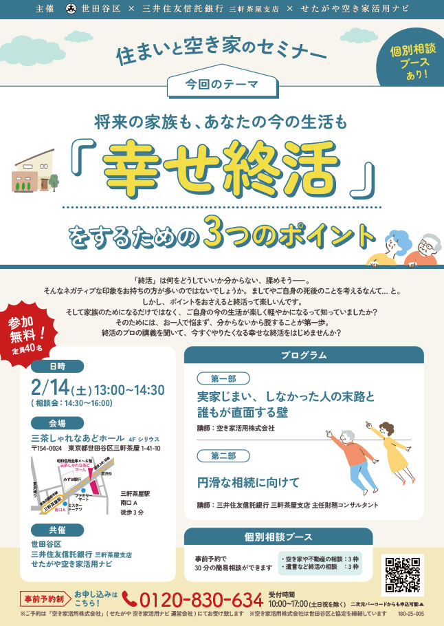 2/14(土)三茶しゃれなあどで、「住まいと空き家のセミナー」が開催されます。今回のテーマは、“将来の家族も、あなたの今の生活も「幸せ終活」 をするための3つのポイント”です。専門家による講演や個別相談などを通して、終活を始めるポイントを学んでみませんか。