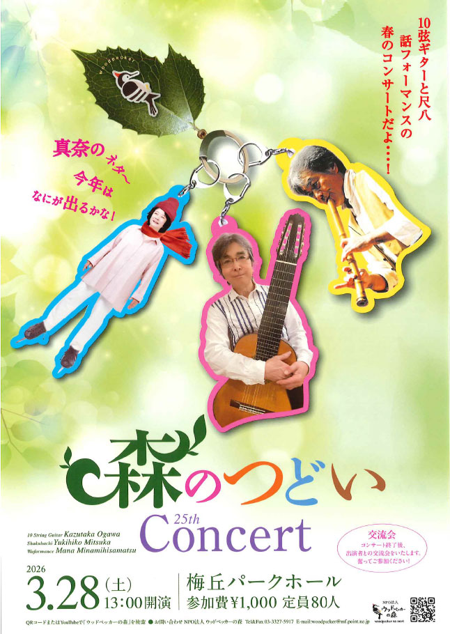 3/28(土)梅丘パークホールにて、ウッドペッカーの森「第25回森のつどいコンサート」が開催されます。十弦ギターと尺八、そして話(わ)フォーマンスのコラボによる、小さいお子さんからお年寄りまで、幅広い年齢の方に楽しんでいただけるコンサートです。終演後は出演者との交流会もあります。