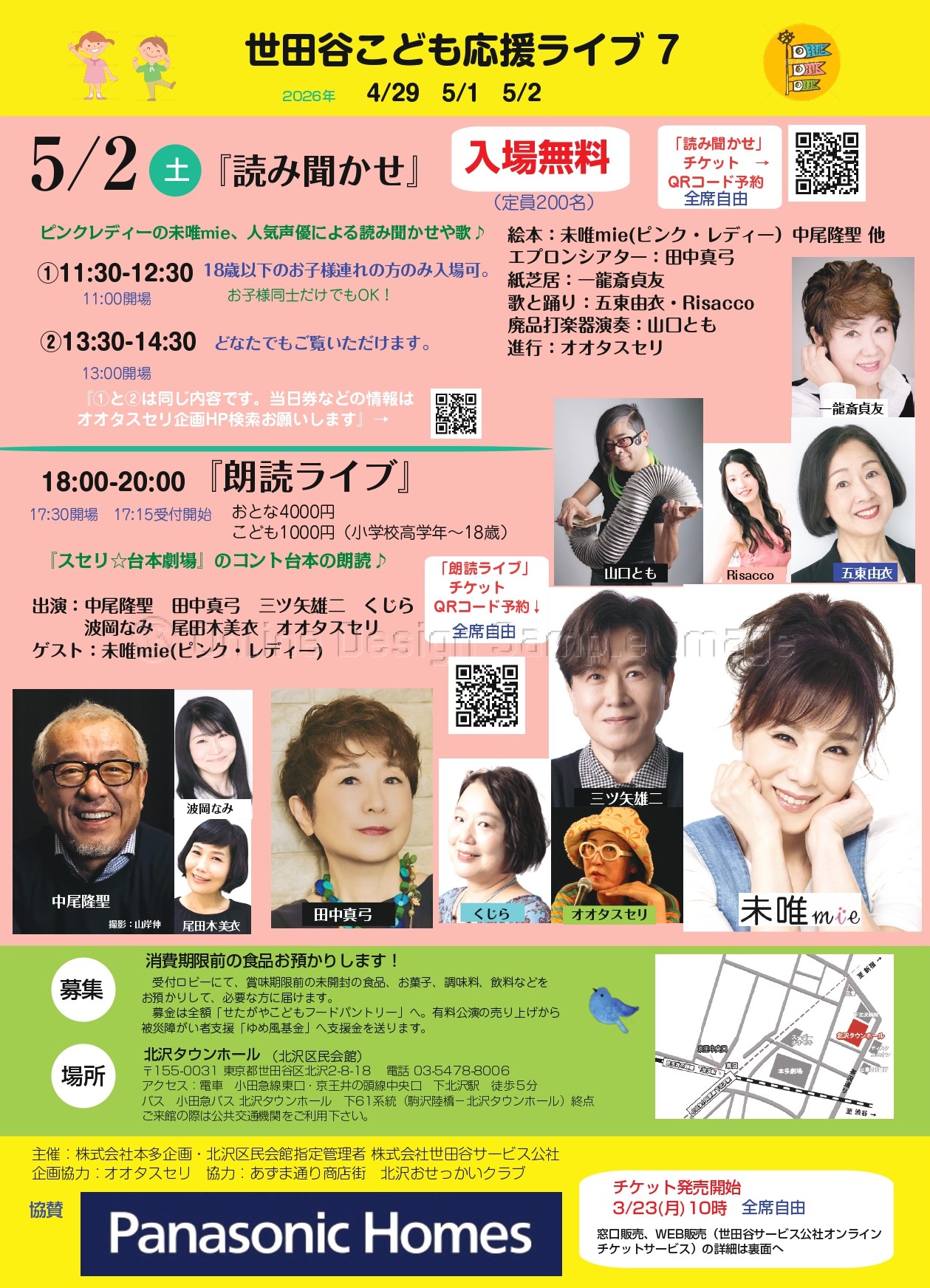 ⑤※入場無料(予約制)『読み聞かせ』11:30開演、13:30開演 (60分間、開場30分前)【出演】中尾隆聖・田中真弓・未唯mie(ピンクレディ)・山口とも 他 ⑥『朗読ライブ』18:00開演 20:00終演(開場30分前)【出演】中尾隆聖・田中真弓・三ツ矢雄二・オオタスセリ・未唯mie(ピンクレディ) 他