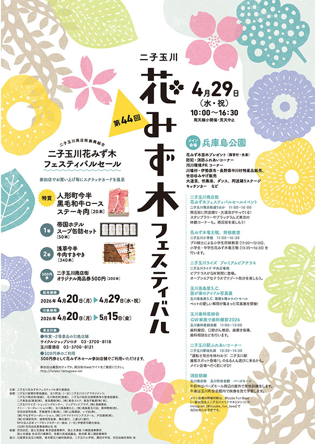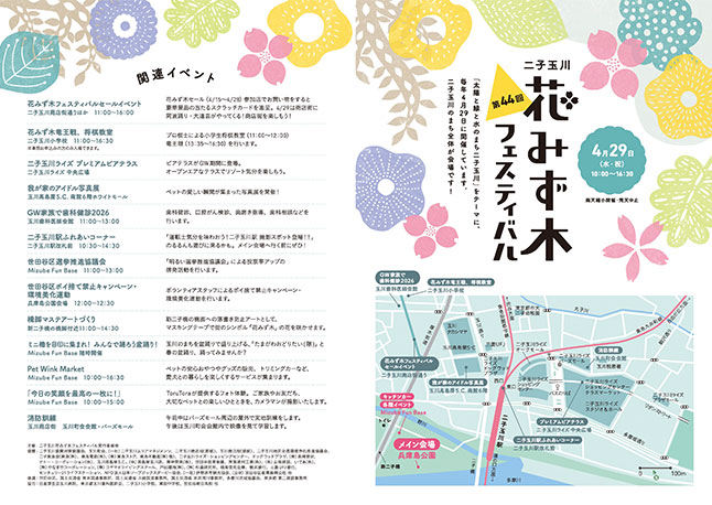 4/29(水・祝)二子玉川駅周辺や兵庫島公園で「第44回二子玉川花みず木フェスティバル」が開催されます。はなみず木の苗木のプレゼント(講習会付・先着)など、イベント盛りだくさんです。