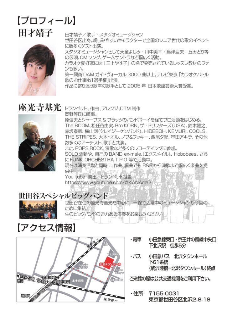 ゲストには、漫才でおなじみの“おぼん こぼん”のおぼん師匠をお迎えし、トランぺッター座光寺基光率いる名プレイヤー揃いの世田谷スペシャルビッグバンドの迫力ある生演奏で、あの頃のヒット曲の数々をお楽しみください!