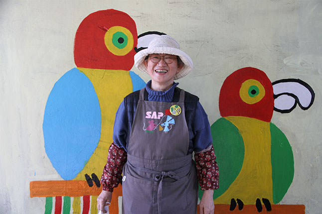 こうした状況を受け、2004年に当時の代田小学校PTA、町会、商店街、地域の有志らが集まり“落書きを塗りつぶすだけではなく、明るく親しみのある絵を描いてみよう”というアイデアを掲げました。これが環七の壁画の第一歩であり、「世田谷代田を住みよく安心なまちにしよう!プロジェクト実行委員会」(以下、SAP)の原点となりました。当時から運営に携わる田代 朝子(たしろ ともこ)さんにお話を伺いました。