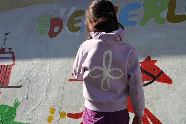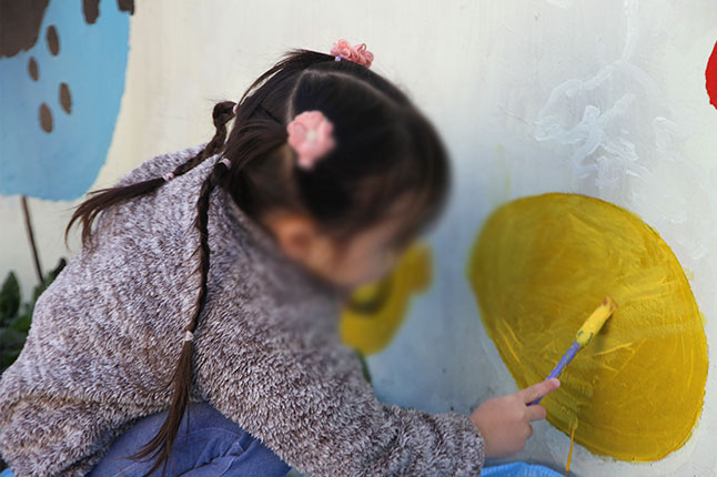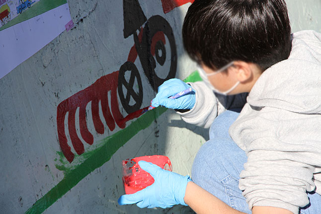 取材に訪れた日も、たくさんの人が参加していました。薄くなった壁画にペンキを重ねたり、消えてしまった部分は下絵を見ながら描き直したり、子ども達も夢中で壁画を描いています。高い所は爪先立ったり、地面に近い所は膝を付いたりしながら、集中して筆を駆使し、丁寧にペンキで塗っていきます。汚れている所は雑巾で拭いてから塗ります。大人にも負けないくらい、あちらこちらで子ども達がメンテナンスに活躍している姿が印象的でした。