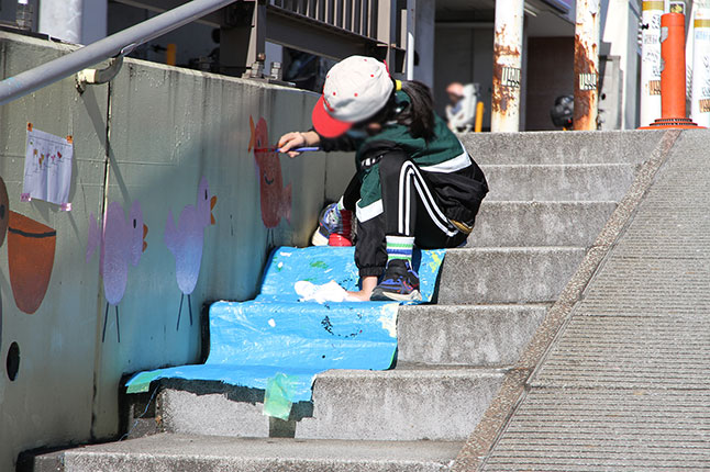 みんなで描いた壁画は、ただの絵ではありません。多くの人が参加して、手や服をペンキで汚しながら、ひと筆ひと筆集中して時間を費やし、大切に描いた壁画です。その明るく楽しいデザイン画は、通りかかれば、ふと目が行きます。こうして通路の雰囲気が変わった事によって、以前のような落書き・ゴミ・放置自転車は驚くほど減り、通学路や生活圏としての安心感が取り戻されました。始まった頃に手伝っていた小学生は、お父さんお母さんになって、その子どもがまた壁画描きに参加しています。この壁画は、地域の人々が心を込めて築き上げた、街の共有財産です。