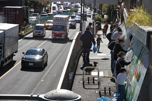 環七の壁画は、高架下の歩道、南北の両壁150メートルずつ、あわせておよそ300メートルにわたる壁面をキャンバスにしたペンキ画です。最初の制作は2004年に行われました。