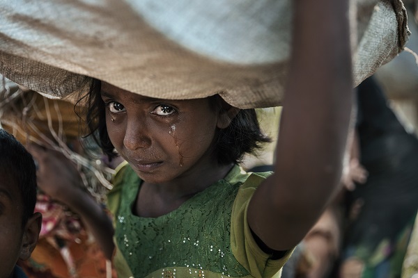 PALONG KHALI, BANGLADESH – OCTOBER 16: A Rohingya girl cries, traumatized after days of walking, with little sleep, as refugees fleeing from Myanmar wait in the hot sun on a muddy rice field near Palang Khali, Cox’s Bazar, Bangladesh. Well over a half a million Rohingya refugees have fled into Bangladesh since late August during the outbreak of violence in Rakhine state causing a humanitarian crisis in the region with continued challenges for aid agencies.