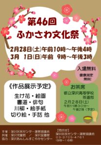 内容:生花、絵手紙、絵画、切り絵、書道、川柳、俳句の作品展示、手話体験、東京都立深沢高等学校によるお茶会(2月28日(土)のみ、午前11時30分~午後2時を予定)、深沢あんしんすこやかセンターによる健康測定