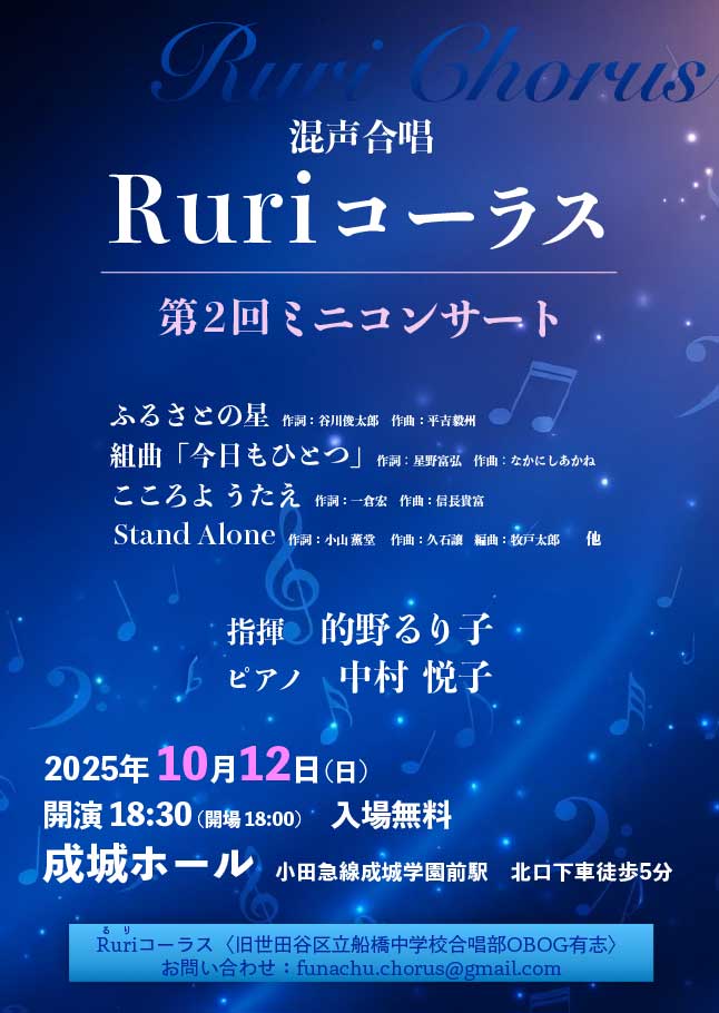 10/12(日)成城ホールにて、「Ruriコーラス 第2回ミニコンサート」が公演されます。