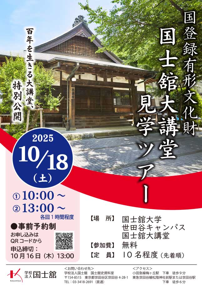 10/18(土)、11/15(土)の両日、国士舘大学では、学生ガイドが案内する「国登録有形文化財 国士舘大講堂 見学ツアー」を開催します。また、同大講堂では10/28~11/4の期間で、創立記念展「 国士舘生の記憶と記録 戦後80年」も開催されます。