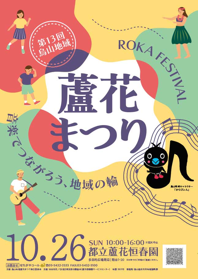 今年は「音楽でつながろう、地域の輪」をテーマに、蘆花恒春園で開催します。地域の学校・団体によるパフォーマンス、ふるさと物産展や模擬店、子ども遊びブース、スポーツ体験ブース、お楽しみ抽選会など内容盛りだくさんのおまつりです。