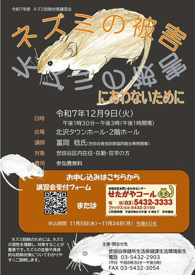 - 北沢タウンホール 令和7年度ネズミ防除対策講習会「ネズミの被害にあわないために」参加者募集 (11/24〆切)