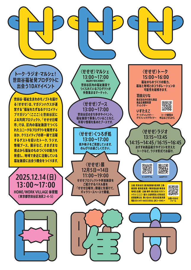 12/14(日)池尻のHOME/WORK VILLAGEで「せせせ日曜市」が開催されます。マルシェでは、ユニークなプロダクトやお菓子などの販売のほか、ゲストトークやラジオ放送、展示など様々な視点から福祉施設の商品や活動を紹介するイベントです。