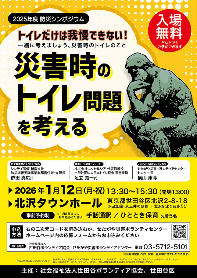 2026年 1/12(月・祝)北沢タウンホールにて、社会福祉法人世田谷ボランティア協会による、2025年度 防災シンポジウム「災害時のトイレ問題を考える」が開催されます。防災機材、携帯トイレについてのスペシャリストをお招きして、災害時のトイレについて考えるシンポジウムです。