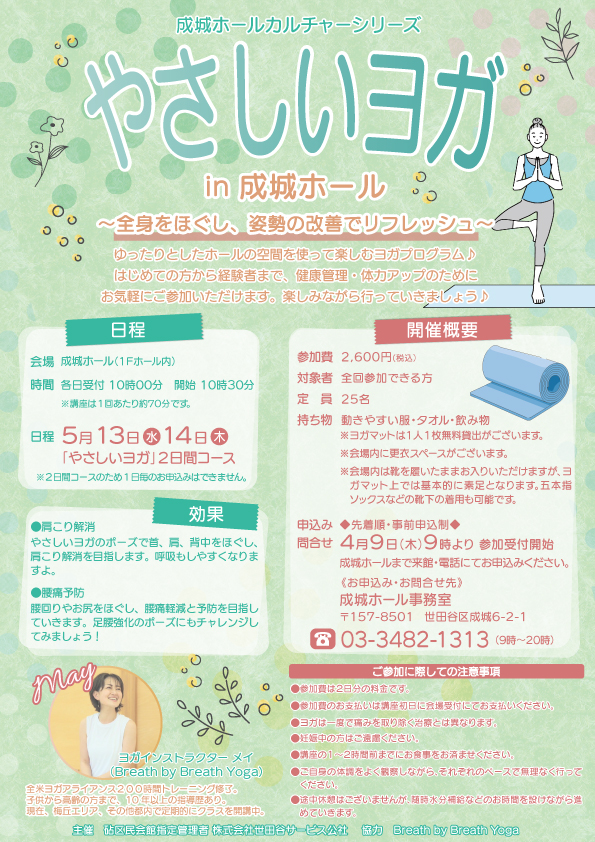 - 成城ホールカルチャーシリーズ「やさしいヨガ」(2日間コース)