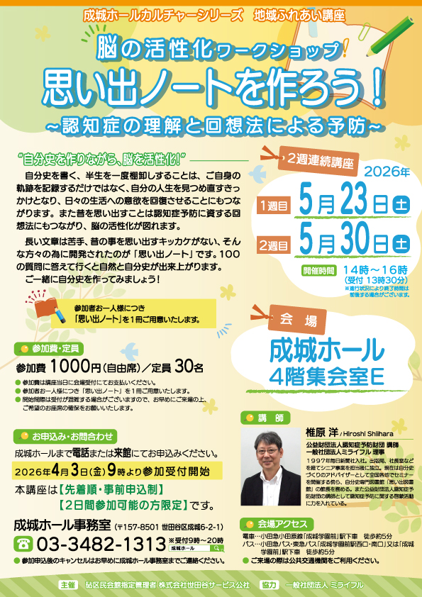 - 成城ホールカルチャーシリーズ「脳の活性化ワークショップ 思い出ノートを作ろう!」(2週連続講座)