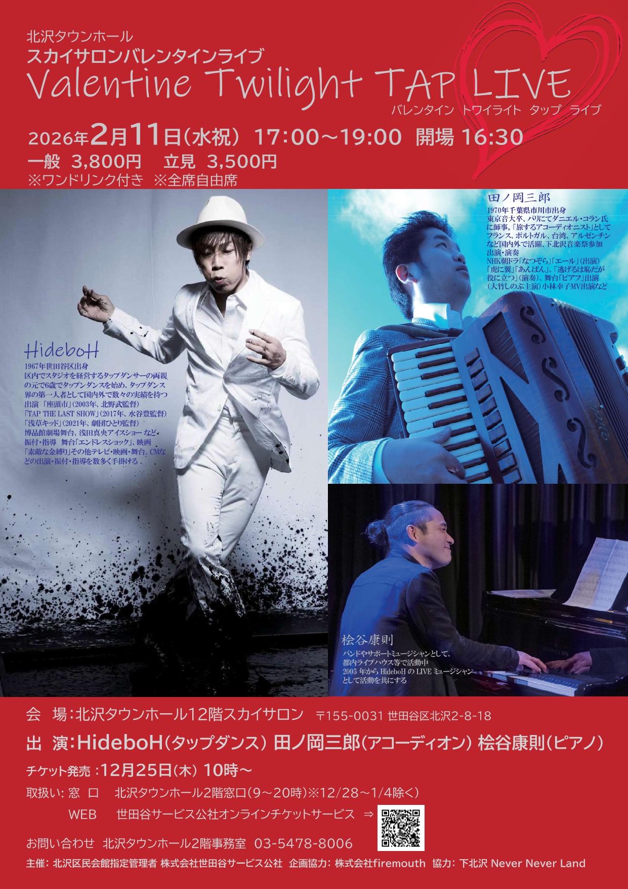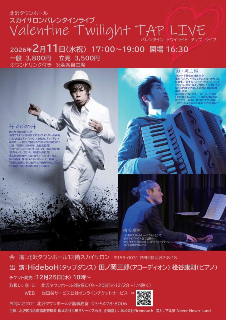 世田谷出身・在住の世界的にも著名なタップダンサーHideboHがお送りする、スカイサロンバレンタインライブ『Valentine Twilight TAP LIVE』