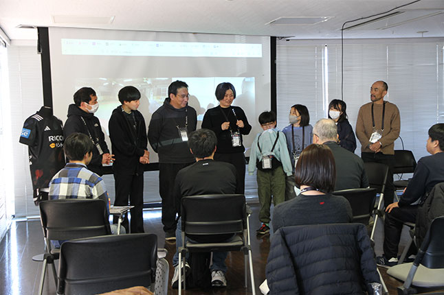 NPO法人世田谷区聴覚障害者協会 本多 忠雅(ほんだ ただまさ)さん、他5名、デフラグビー日本代表ヘッドコーチ 柴谷 晋(しばたに すすむ)さん、デフラグビー日本代表選手1名、手話ラグビー参加者5名、聴覚障がい者向けコミュニケーションサービスPekoe(ペコ)開発メンバー 株式会社リコー木下 健吾(きのした けんご)さん、脊髄損傷者専門トレーニングジムJ-Workout(ジェイ・ワークアウト)渡辺 麻衣(わたなべ まい)さん、国立成育医療研究センター「もみじの家」シニアアドバイザー 兼 世田谷区医療的ケア相談支援センターHi・Na・Ta(ひなた)広報マネージャー 内多 勝康(うちだ かつやす)さん、ブラックラムズの選手やスタッフ、そして徳島からオンライン参加したパラリンピアン藤本 聰(ふじもと さとし)さんなどが集まりました。