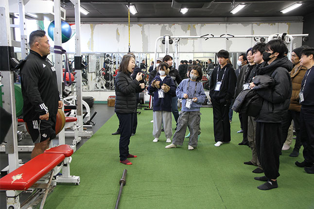 トレーニングジムを見学し、選手の説明に耳を傾ける参加者