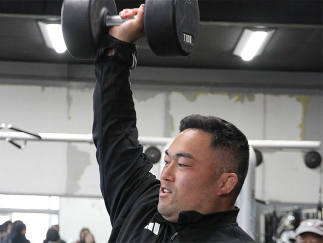 たくさんのマシンが置いてあるトレーニングジムでは、千葉選手が次々と実演。重そうなマシンを軽々動かす様子や、重量を感じる迫力のあるマシンの音に驚きの声が上がります。子どもたちや参加者が力試しに挑戦する姿もありました。
